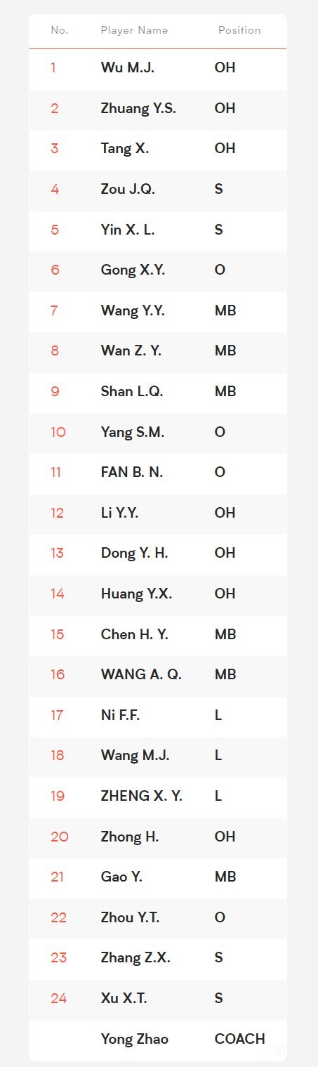 奥运冠军、新一届中国女排队长龚翔宇领衔,李盈莹、王媛媛、王梦洁三位世界杯冠军入围。