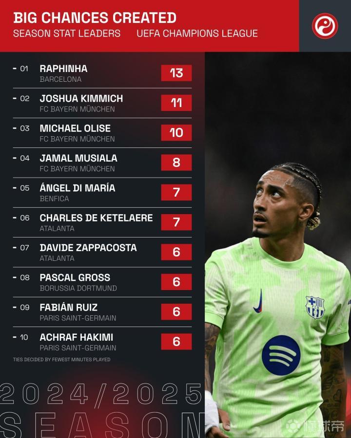 13次,拉菲尼亚是本赛季欧冠创造绝佳机会最多的球员