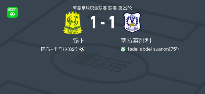 阿曼足球职业联赛第22轮,锡卜主场迎战塞拉莱胜利。比赛中,塞拉莱胜利由fadel abdel suanon通过点球机会打破僵局。随后,锡卜的阿布-卡马拉成功打入一球扳平比分。最终,双方以1-1的比分握手言和。
