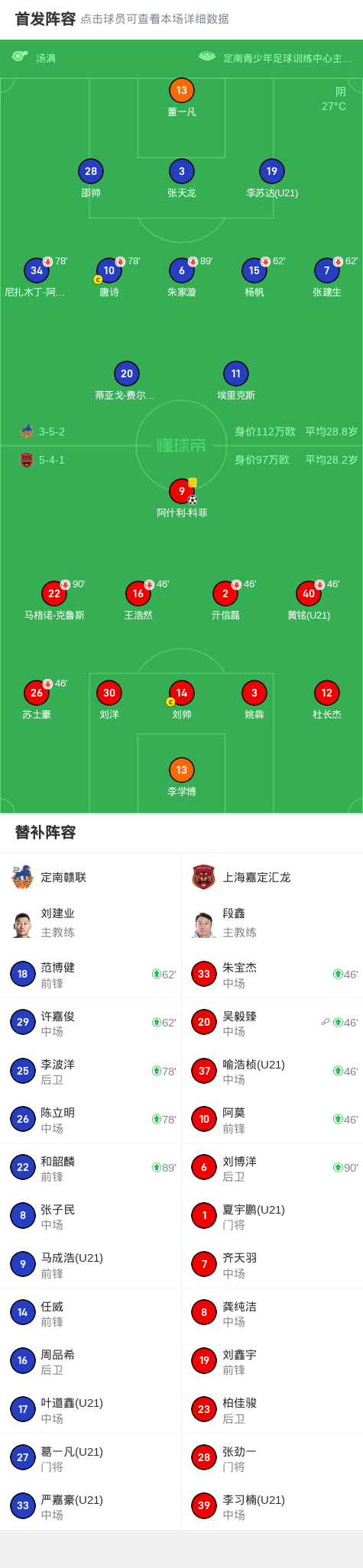 上海嘉定汇龙客场1-0定南赣联,科菲制胜球,吴毅臻送助攻