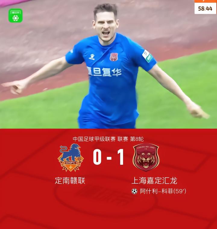 第59分钟,打破僵局,科菲头球率先得分,上海嘉定汇龙1-0领先