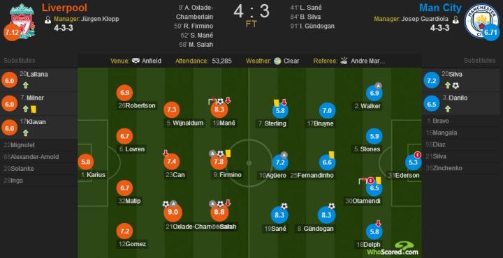利物浦方面,传射建功的张伯伦获得了全场最高的9分!曼城方面,收获进球的萨内和京多安并列获得全队最高的8.3分。
