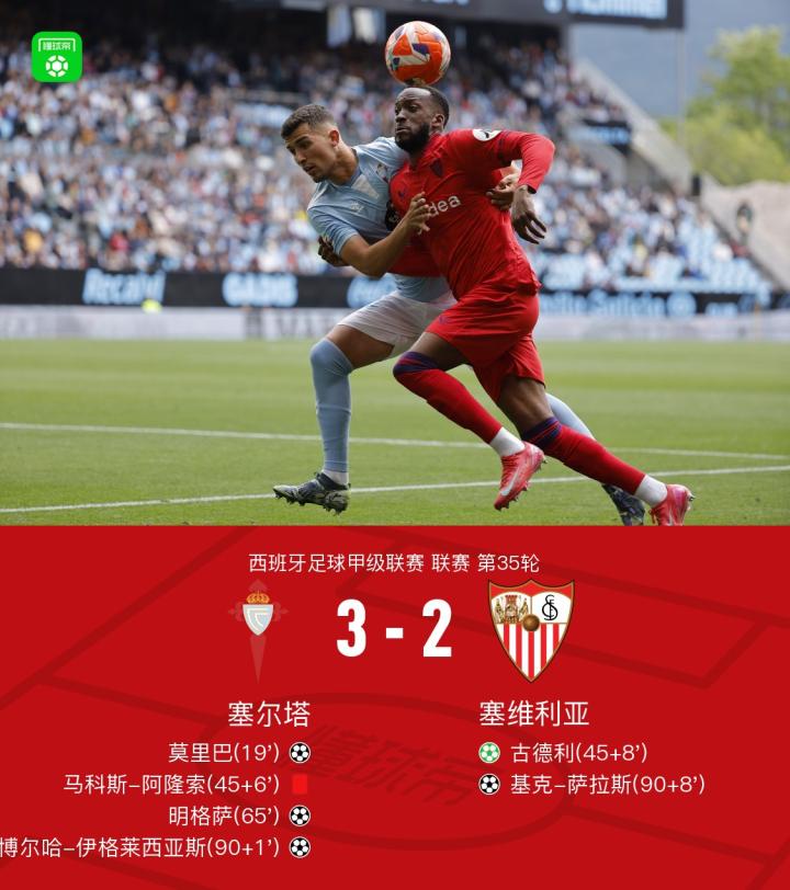 在北京时间5月10日进行的西班牙足球甲级联赛第35轮比赛中,塞尔塔主场迎战塞维利亚。比赛开始后,莫里巴率先为塞尔塔取得进球。上半场补时阶段,塞尔塔遭遇红牌减员,随后塞维利亚由古德利通过点球机会扳平比分。易边再战,明格萨为塞尔塔再次取得领先。补时阶段,博尔哈-伊格莱西亚斯的进球帮助塞尔塔扩大优势,但基克-萨拉斯随后为塞维利亚再追一球。最终,塞尔塔以3-2战胜塞维利亚。