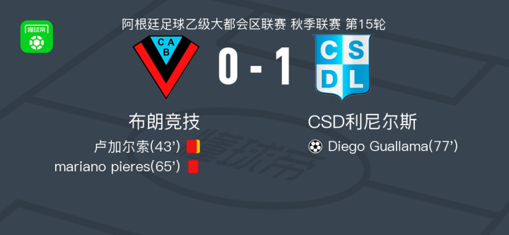 北京时间5月11日阿根廷足球乙级大都会区联赛 秋季联赛 第15轮,布朗竞技主场对阵CSD利尼尔斯。CSD利尼尔斯Diego Guallama破门。最终比分布朗竞技 0-1 CSD利尼尔斯。