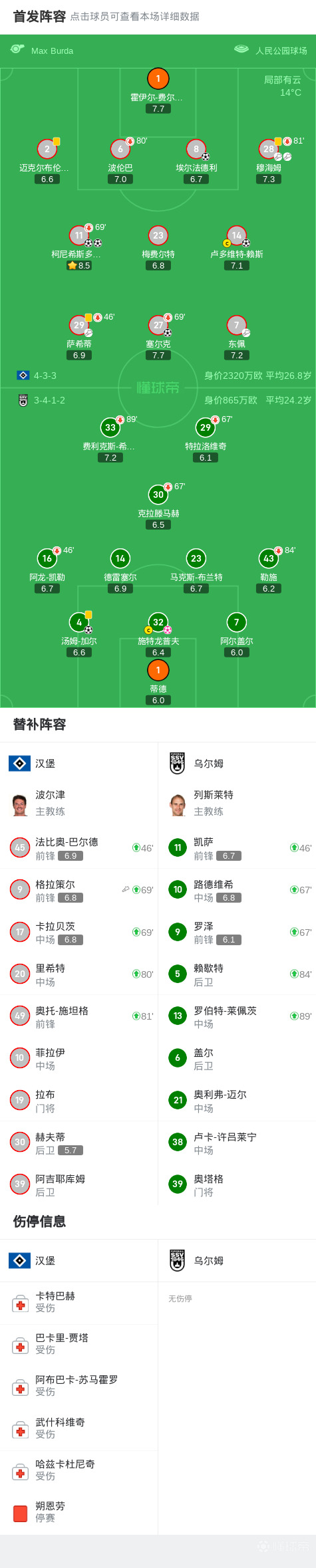 第10分钟,光速扳平,穆海姆助攻,赖斯推射破门,汉堡1-1乌尔姆