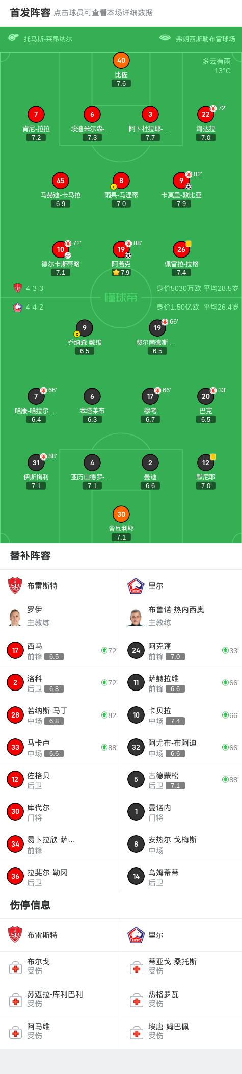 布雷斯特2-0里尔,阿若克破门,敦比亚建功,阿克蓬中框
