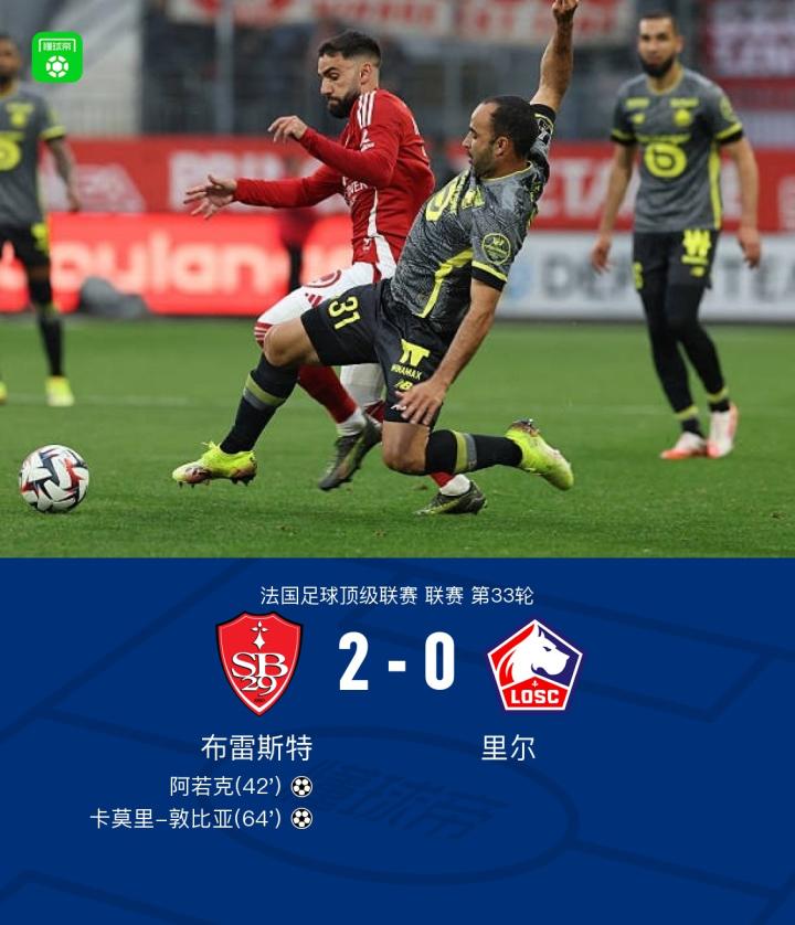 北京时间5月11日,法国足球顶级联赛第33轮,布雷斯特主场迎战里尔。比赛中,阿若克接队友助攻为布雷斯特首开纪录,随后卡莫里-敦比亚再入一球扩大领先优势。最终,布雷斯特以2-0战胜里尔。