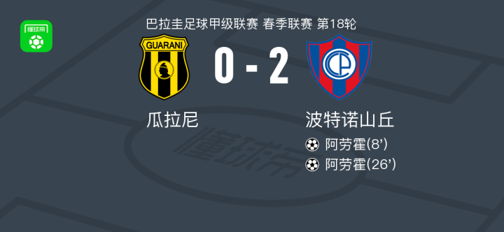 巴拉圭足球甲级联赛春季联赛第18轮,瓜拉尼主场迎战波特诺山丘。比赛中,波特诺山丘的阿劳霍表现出色,完成梅开二度,为球队锁定胜局。最终,瓜拉尼0-2不敌波特诺山丘。