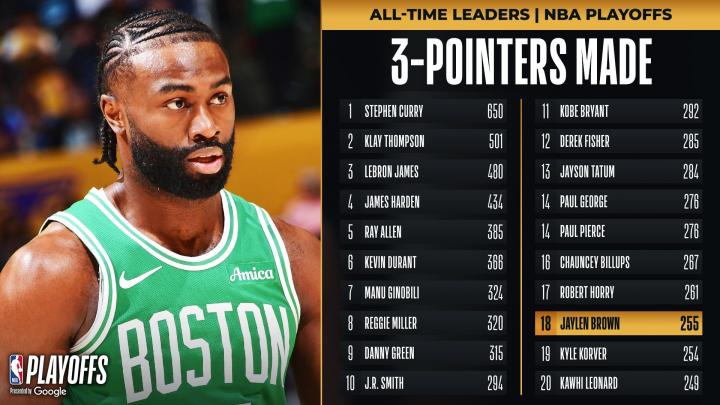 杰伦-布朗G3三分6中2,超越科沃尔升至季后赛三分榜第18位