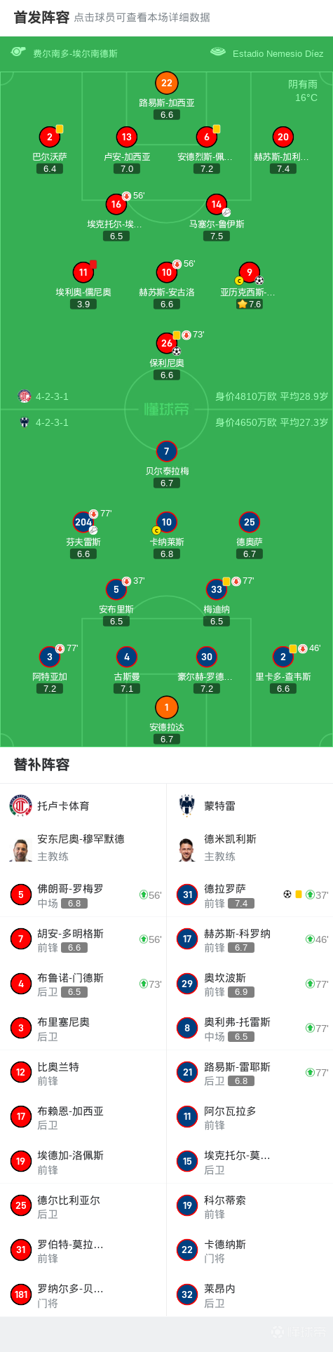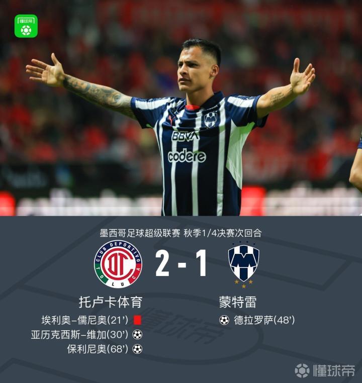 托卢卡体育2-1蒙特雷,两回合总比分5-5,蒙特雷遭淘汰无缘半决赛