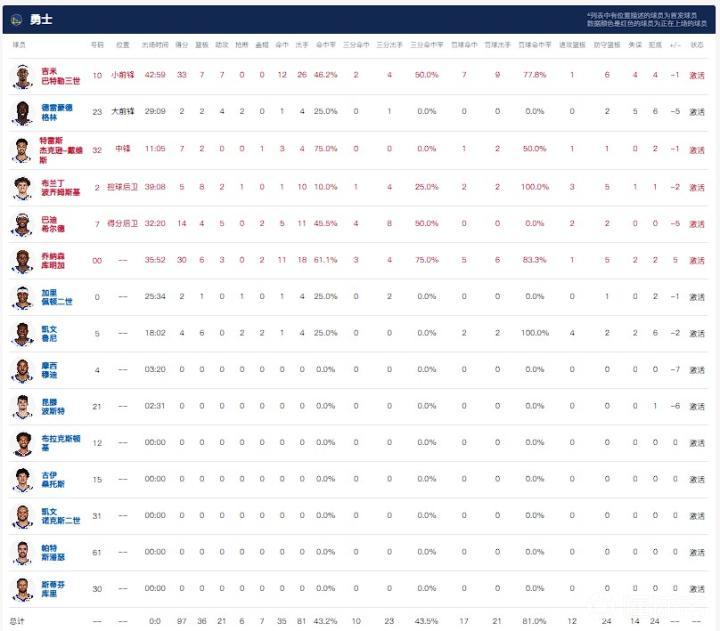 金州勇士吉米-巴特勒33分7板7助,库明加30分6板3助;明尼苏达森林狼安东尼-爱德华兹36分4板4助,兰德尔24分10板12助。