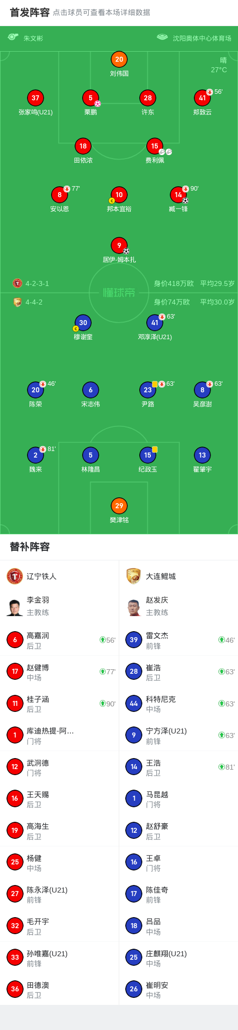 第50分钟,姆本扎反越位单刀挑射破门,辽宁铁人2-0大连鲲城