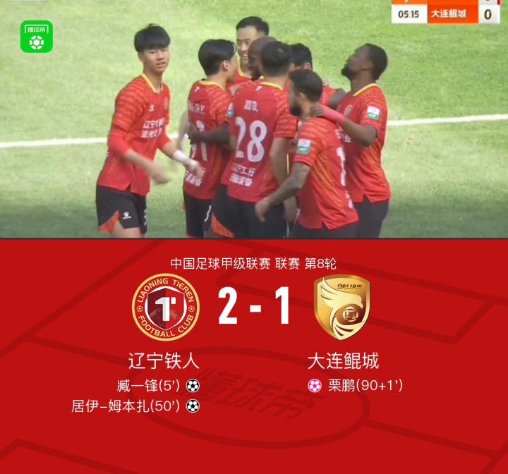 北京时间5月11日,中国足球甲级联赛第8轮,辽宁铁人主场迎战大连鲲城。比赛中,臧一锋接队友助攻打入一球为球队取得领先,随后居伊-姆本扎再次建功扩大优势。然而在比赛最后阶段,栗鹏不慎将球送入自家球门。最终,辽宁铁人以2-1战胜大连鲲城。