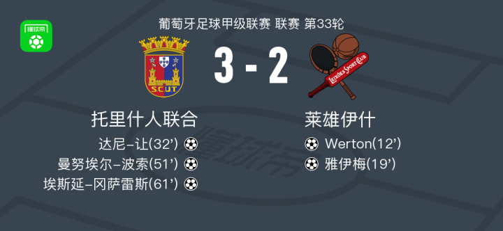 北京时间5月11日,葡萄牙足球甲级联赛第33轮,托里什人联合主场迎战莱雄伊什。比赛中,莱雄伊什凭借Werton和雅伊梅的进球取得领先。随后,托里什人联合展开反击,达尼-让、曼努埃尔-波索以及埃斯延-冈萨雷斯接连建功,帮助球队实现逆转。最终,托里什人联合以3-2战胜莱雄伊什。