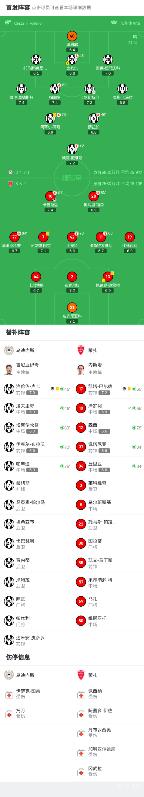 第75分钟,乌迪内斯球员卡尔斯特伦助攻洛伦佐-卢卡打入一球。
