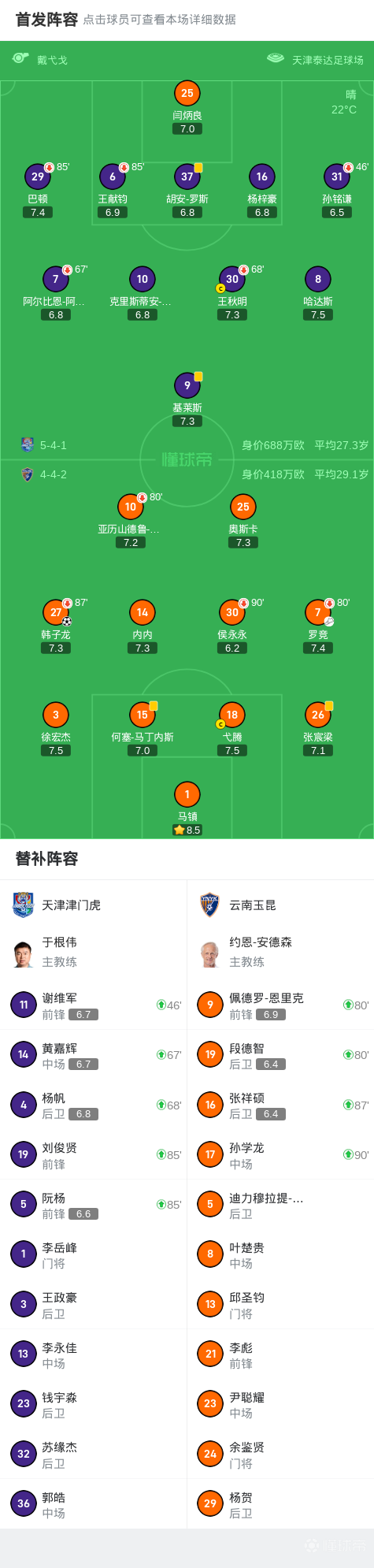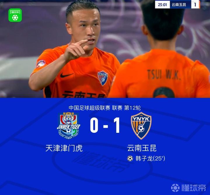 北京时间5月11日19:00,中超第12轮,天津津门虎主场对阵云南玉昆。上半场,韩子龙单刀破门,侯永永单刀被扑;下半场,双方均无建树。最终天津津门虎0-1不敌云南玉昆。