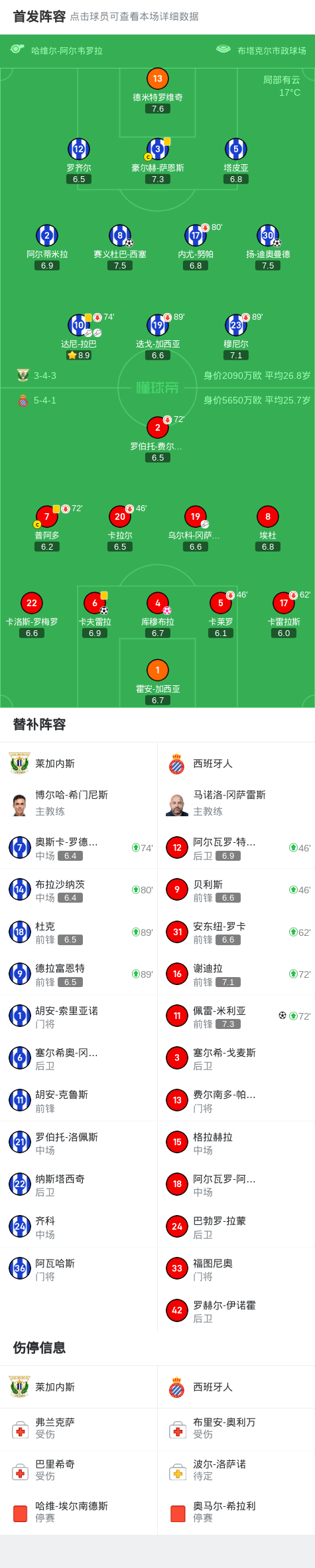 第33分钟,莱加内斯球员达尼-拉巴助攻赛义杜巴-西塞打入一球。