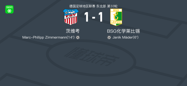 北京时间5月11日,德国足球地区联赛东北部第33轮,茨维考主场迎战BSG化学莱比锡。比赛中,BSG化学莱比锡由Janik Mäder率先取得进球,茨维考随后由Marc-Philipp Zimmermann扳平比分。最终,双方以1-1的比分握手言和。