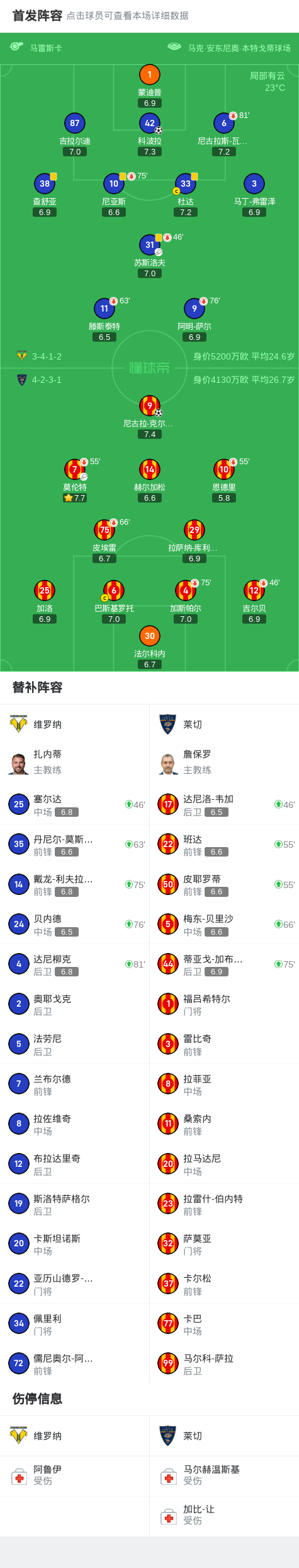 第23分钟,莱切球员莫伦特助攻尼古拉-克尔斯托维奇打入一球。