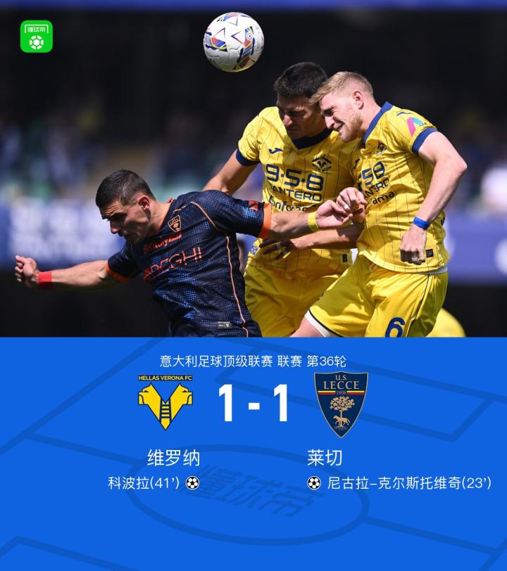 意大利足球顶级联赛第36轮,维罗纳主场迎战莱切。比赛中,莱切由尼古拉-克尔斯托维奇率先打破僵局,随后维罗纳依靠科波拉的进球将比分扳平。最终,双方以1-1的比分结束本场比赛。