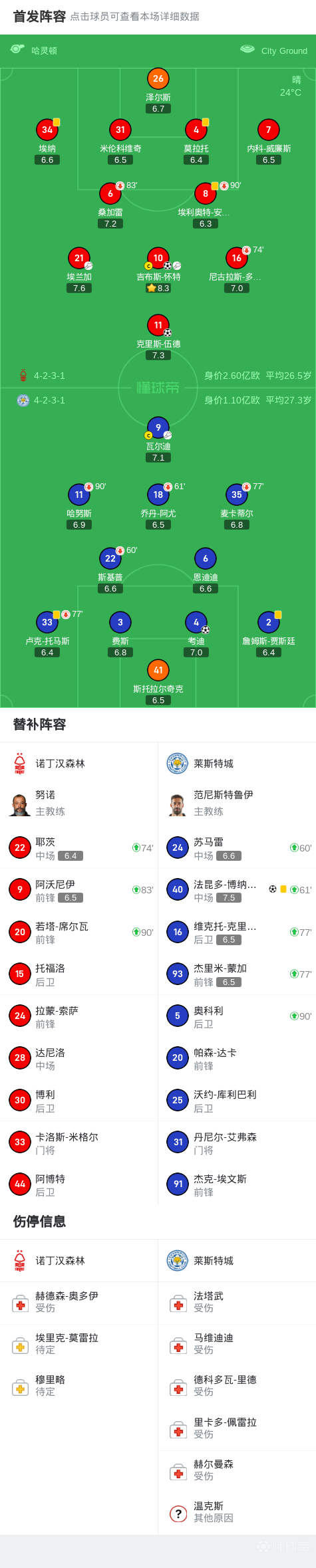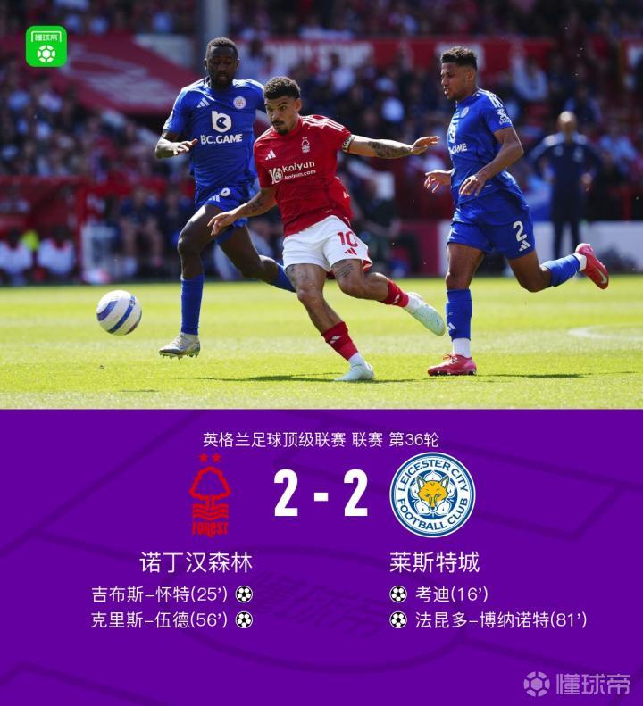 英格兰足球顶级联赛第36轮,诺丁汉森林主场迎战莱斯特城。上半场,考迪率先打破僵局,吉布斯-怀特在埃兰加的助攻下扳平比分;下半场,克里斯-伍德再入一球,博纳诺特扳平最终将比分定格为2-2,双方各取一分。