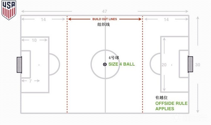 美国足球联盟在他们的7v7比赛中引入了“组织线”。这是一条距离球门14码的线,当守门员发门球时,对手必须退到“组织线”外。让守门员和队友可以在不受任何压力的情况下组织比赛。守门员不被允许直接从后场开大脚,因为USSF认为这将会破坏建立“组织线”的目的,减少了从后场组织的机会。
