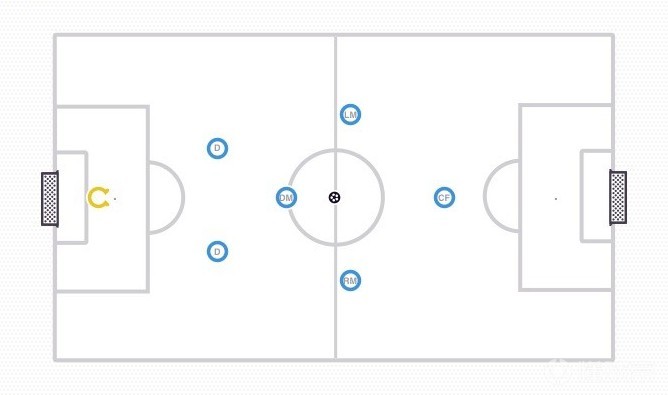 一名守门员,2名后卫,1名控球中场,左右2名中场球员和1名进攻球员组成2-1-2-1阵型。这个阵型有利于控球时的配合和无球时的快速收紧。