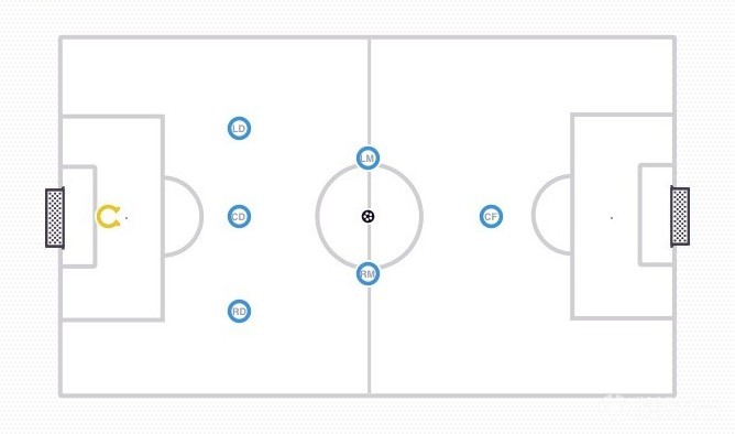 在这阵型中有一个守门员,2个后卫,3个中场(左,中,右)和1个进攻球员。这种阵型有利于传球、跑动和丢球后快速回防。