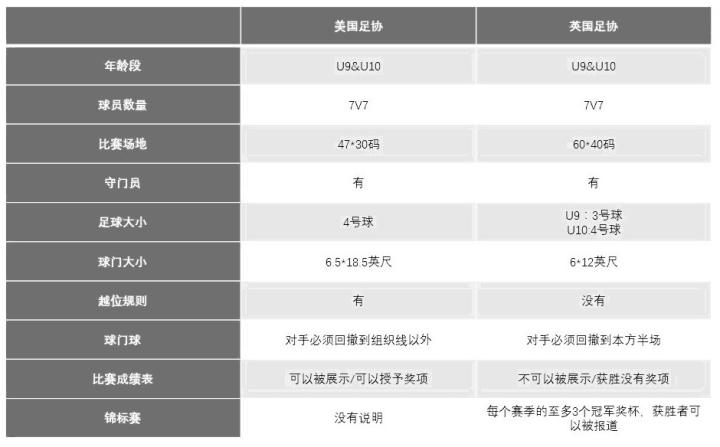 这些计划包括U9球员从4v4过渡到7v7,并在U10年龄段进行 7v7训练。和相同年龄段的英格兰7v7足球指南相比,USSF 7v7中有一些有趣的变化。下面的图表中就反应了这些差异。