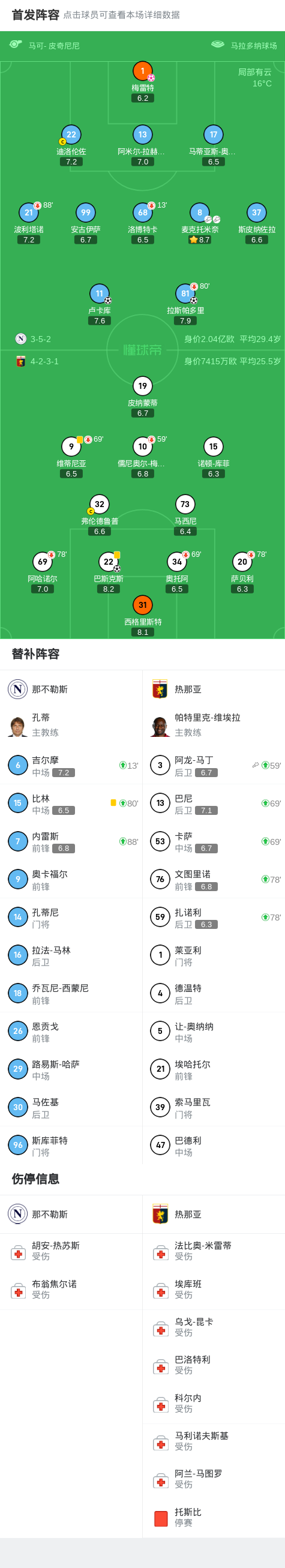 第32分钟,阿哈诺尔头球攻门打在梅雷特身上进网将比分扳平,热那亚1-1