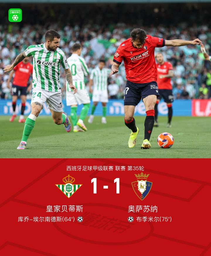 北京时间5月12日,西班牙足球甲级联赛第35轮,皇家贝蒂斯主场迎战奥萨苏纳。比赛中,皇家贝蒂斯由库乔-埃尔南德斯完成破门,为球队取得领先。随后,奥萨苏纳凭借布季米尔的进球将比分扳平。最终,双方以1-1的比分结束比赛。