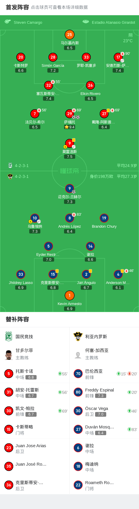 哥伦比亚足球甲级联赛春季联赛第18轮,国民竞技主场迎战利亚内罗斯。比赛中,国民竞技的萨缅托表现出色,完成两粒进球,为球队奠定领先优势。利亚内罗斯方面,迈克尔-兰赫尔打入一球,为客队追回一分。最终,国民竞技以2-1战胜利亚内罗斯。
