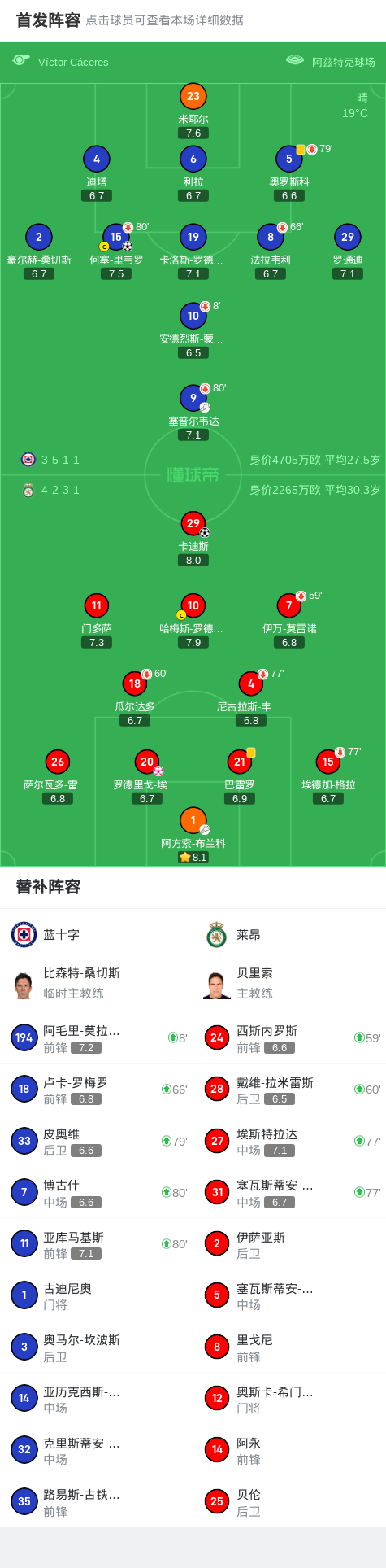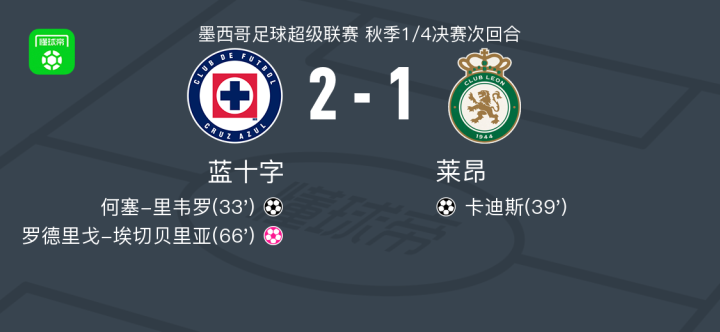 北京时间5月12日墨西哥足球超级联赛 秋季1/4决赛次回合,蓝十字主场对阵莱昂。蓝十字何塞-里韦罗破门。莱昂卡迪斯破门,罗德里戈-埃切贝里亚自摆乌龙。最终比分蓝十字 2-1 莱昂。两回合总比分蓝十字5-3莱昂。