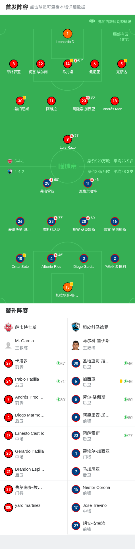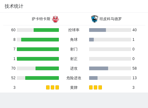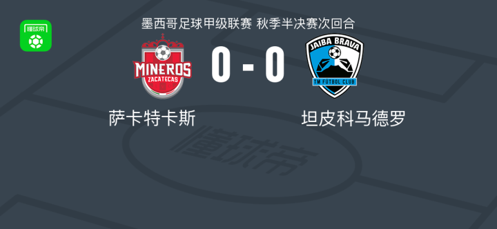 萨卡特卡斯0-0坦皮科马德罗,双方握手言和战报bot @懂球帝2025-05-12 11:07北京时间5月12日,墨西哥足球甲级联赛秋季半决赛次回合,萨卡特卡斯主场迎战坦皮科马德罗。本场比赛双方均未能取得进球,最终以0-0的比分结束。两回合总比分,坦皮科马德罗凭借首回合的优势,以1-0淘汰萨卡特卡斯,成功晋级下一阶段。点击查看本场比赛详细数据>>点击查看墨甲完整积分榜>> 球队阵容 技术统计 展开更多