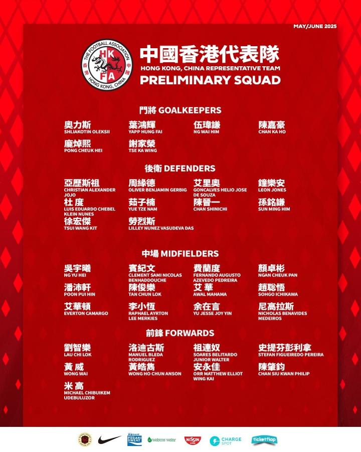 北京时间5与12日,中国香港足总公布了6月国际比赛日的37人初选大名单,其中中超、中甲10人在列,5月30日20:00中国香港将与曼联交手。