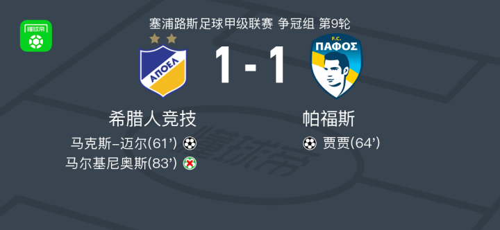 北京时间5月13日塞浦路斯足球甲级联赛 争冠组 第9轮,希腊人竞技主场对阵帕福斯。希腊人竞技马克斯-迈尔破门。帕福斯贾贾破门。最终比分希腊人竞技 1-1 帕福斯。