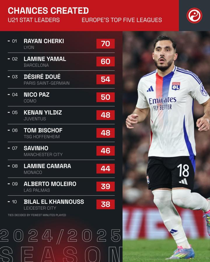 2024/25赛季五大联赛U21球员创造机会次数排行榜(截至5月12日)