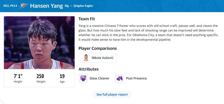 与此同时,各大选秀网站也更新了最新的模拟选秀名单,权威网站雅虎体育将杨瀚森排在了第44顺位,这也是自进入模拟选秀名单以来,杨瀚森的最高模拟顺位。雅虎给到杨瀚森的选秀模板是黑山中锋武切维奇,他也具备着欧洲中锋擅长传球、技术全面且拥有投射的特点。