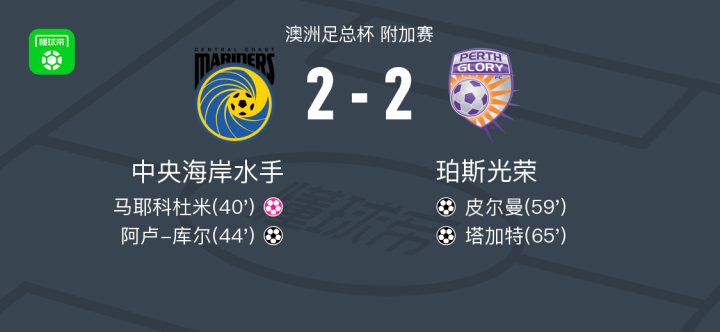 北京时间5月13日,澳洲足总杯附加赛,中央海岸水手与珀斯光荣展开较量。比赛中,珀斯光荣的马耶科杜米不慎自摆乌龙,为对手送上一分。随后,中央海岸水手的阿卢-库尔抓住机会破门得分。珀斯光荣方面,皮尔曼和塔加特相继建功,帮助球队将比分追平。最终,双方以2-2战平,比赛将进入加时赛。