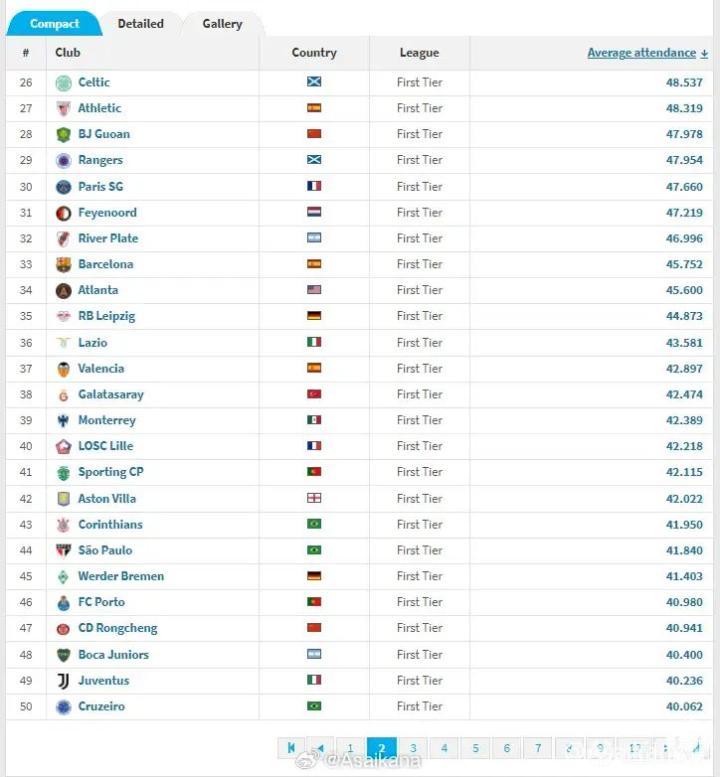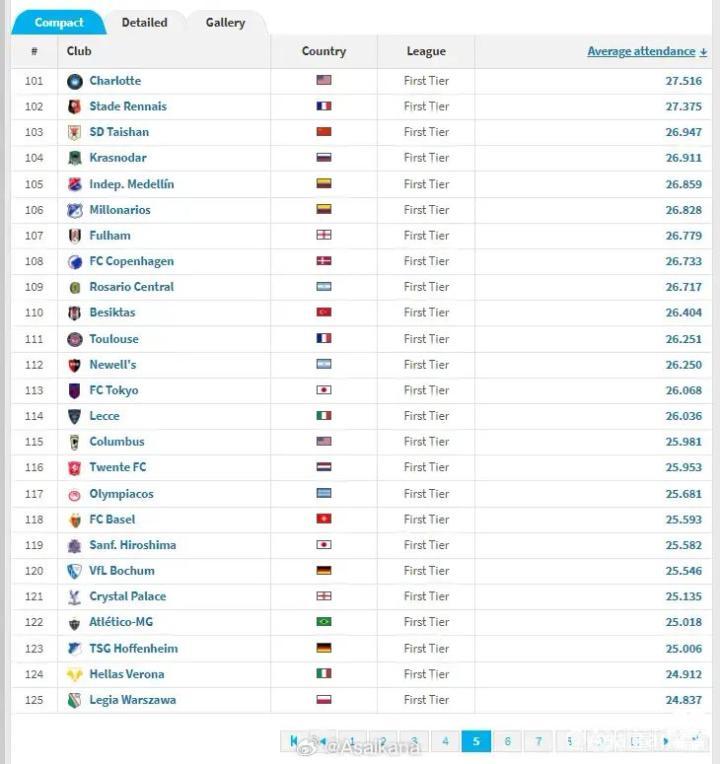 据德转统计大连英博主场场均观众人数43115人位列亚洲第一