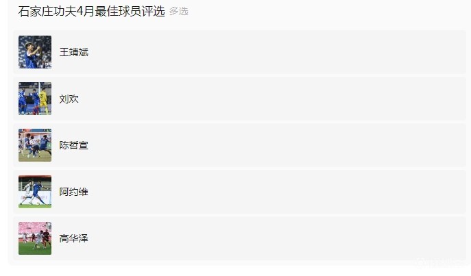 北京时间5月13日,石家庄功夫足球俱乐部官方公布了石家庄功夫队四月份最佳球员投票候选,5名候选人分别是王靖斌、刘欢、陈哲宣、阿约维和高华泽。