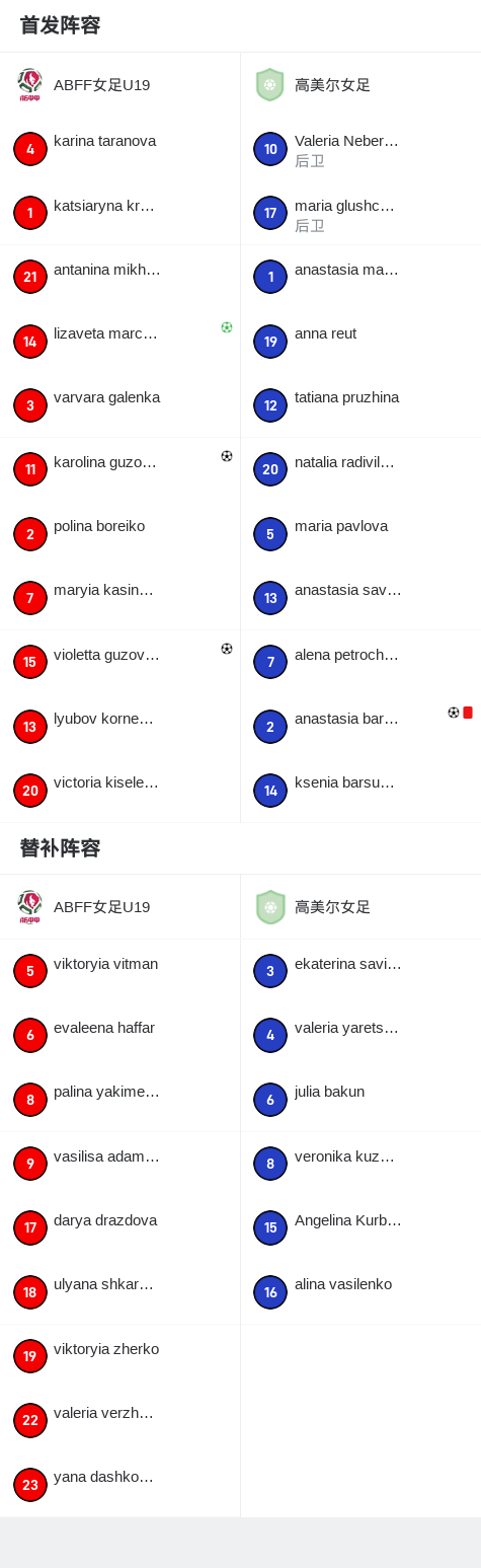 第80分钟,高美尔女足球队anastasia barkova吃到红牌。