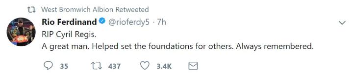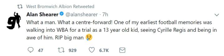 雷吉斯9月底还来到山楂球场,参加了西布朗主办的多样性活动日,为支持残障人士和LGBT群体平等地享受足球而站台助威。如今天人两隔,除了西布朗的球员与球迷,莱因克尔、希勒、安迪·科尔、费迪南德等英格兰名宿也加入了致敬的队伍。
