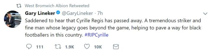 西布朗足球俱乐部沉痛地宣布,球队历史上最伟大的前锋之一、黑人球员进入英国足坛的先驱——西里尔·雷吉斯,于1月14日晚间突发心脏病过世,享年59岁。
