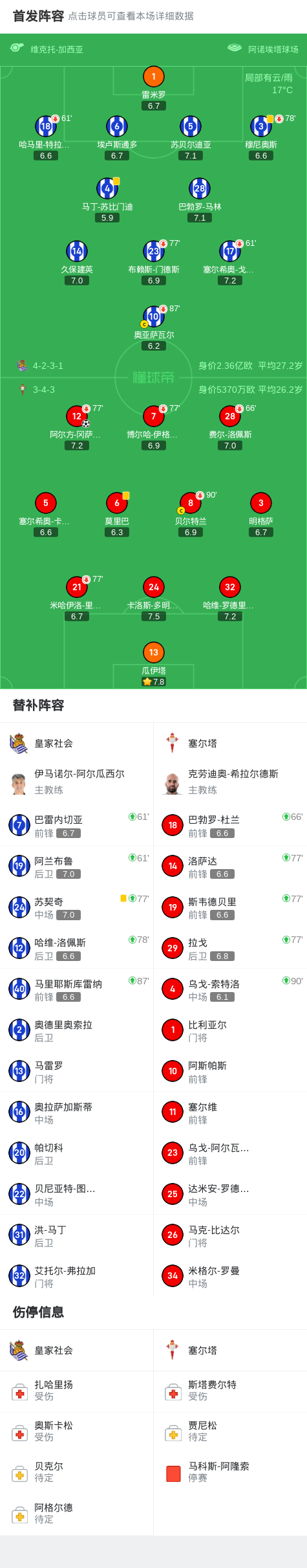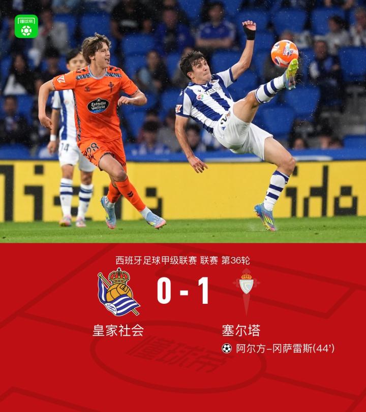 塞尔塔1-0皇家社会,阿尔方-冈萨雷斯制胜球战报bot @懂球帝2025-05-14 04:03北京时间5月14日,西班牙足球甲级联赛第36轮,皇家社会主场迎战塞尔塔。比赛中,塞尔塔凭借阿尔方-冈萨雷斯的关键进球取得领先。最终,皇家社会0-1不敌塞尔塔。点击查看本场比赛详细数据>>点击查看西甲完整积分榜>>精彩瞬间第44分钟,塞尔塔球员阿尔方-冈萨雷斯打入一球。 球队阵容 技术统计 展开更多