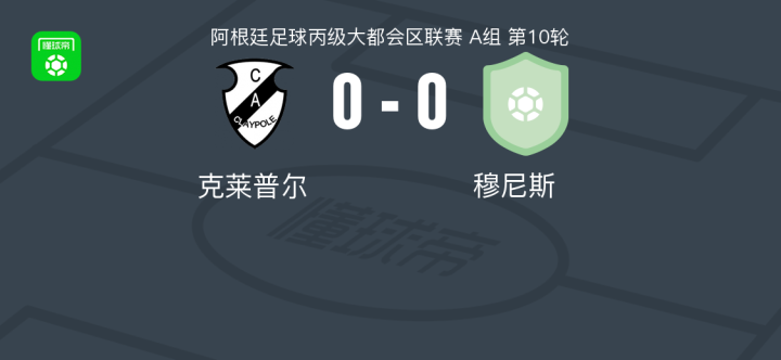 克莱普尔0-0穆尼斯,双方互交白卷战报bot @懂球帝2025-05-14 04:26北京时间5月14日,阿根廷足球丙级大都会区联赛A组第10轮,克莱普尔主场迎战穆尼斯。全场比赛双方均未能取得进球,最终克莱普尔与穆尼斯互交白卷,以0-0的比分握手言和。点击查看本场比赛详细数据>> 技术统计 展开更多