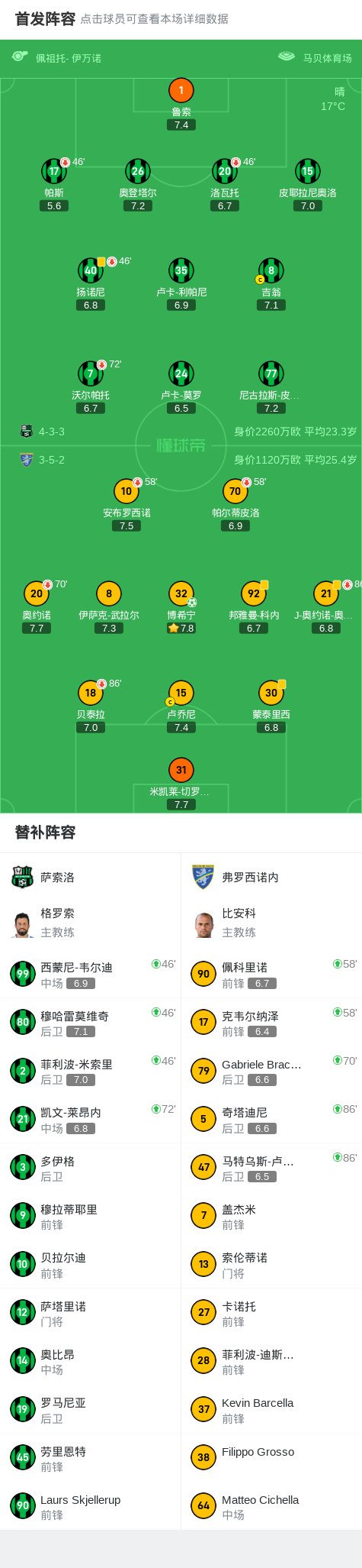 弗罗西诺内1-0萨索洛,博希宁点射制胜战报bot @懂球帝2025-05-14 04:29北京时间5月14日,意大利足球乙级联赛第34轮,萨索洛主场迎战弗罗西诺内。比赛中,弗罗西诺内凭借博希宁的点球破门取得领先。最终,萨索洛0-1不敌弗罗西诺内。点击查看本场比赛详细数据>>点击查看意乙完整积分榜>>精彩瞬间第38分钟,弗罗西诺内球员博希宁罚入点球。 球队阵容 技术统计 展开更多
