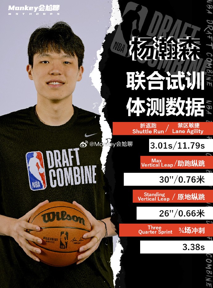 动态数据方面,据博主“Monkey会尬聊”消息,杨瀚森折返跑3.01秒,禁区敏捷测试11.79秒,助跑纵跳0.76米,原地纵跳0.66米,四分之三场冲刺3.38秒。