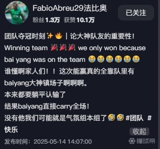 晒照的同时,法比奥写道:“团队胜利时刻✨🔥论大神队友的重要性!🎉🎉🎉”
