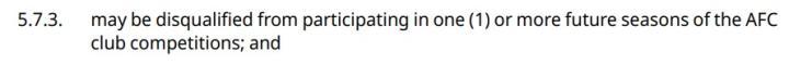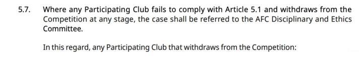 另外,退赛球队将可能被禁止参加未来1届或多届亚足联赛事,在这一点上并没有进行严格的规定,只使用了“可能”(may)这样的字眼。